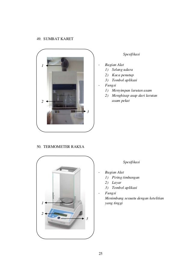 28 01 2014 · 49 SUMBAT KARET Spesifikasi 1 2 Bagian Alat 1 Selang udara 2 Kaca penutup 3 Tombol aplikasi Fungsi 1 Menyimpan larutan asam 2 Menghisap asap dari larutan asam pekat 3 50 TERMOMETER RAKSA Spesifikasi 1 2 3 25 Bagian Alat 1 Piring timbangan 2 Layar 3 Tombol aplikasi Fungsi Menimbang sesuatu dengan ketelitian yang tinggi